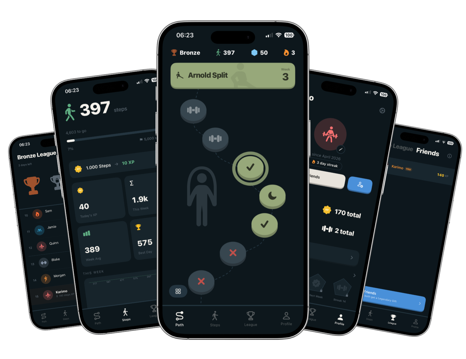 Workouts werden erst beim Drücken von „Fertig" am Ende des Workouts gespeichert. Ein abgebrochenes Workout zählt nicht. Falls das Workout als beendet markiert wurde, aber nicht in der Historie erscheint, starte die App einmal neu — die Daten synchronisieren sich.Freunde & Ligen